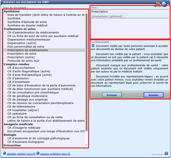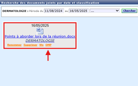 Après avoir déposé un document sur un dossier patient, il est possible d’interagir avec celui-ci pour modifier ses caractéristiques, l’envoyer via le DMP ou une messagerie sécurisée ou simplement le supprimer.