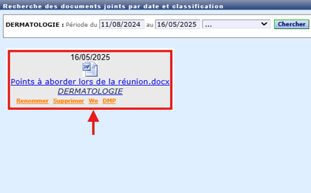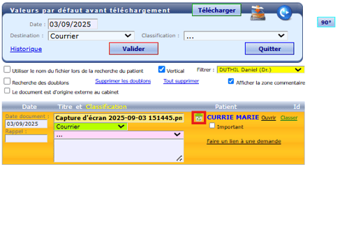 - Depuis la page "Télécharger des documents", cliquer sur la corbeille afin de définitivement supprimer le document des serveurs de WEDA. Il est aussi possible à cette étape de changer le nom du patient pour reclasser ce document dans un autre dossier patient :