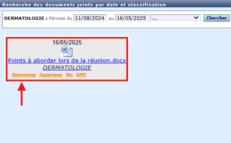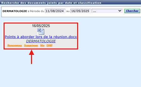 - Cliquer sur "Supprimer" pour retirer le document du dossier patient :