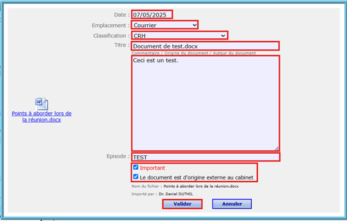 - La page d'édition permet de modifier la date, l’emplacement, la classification, le titre, le commentaire, l’épisode, ou cocher/décocher les options "Important" ou "D’origine externe". Cliquer sur "Valider" pour enregistrer les modifications.