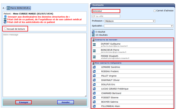 - Sélectionner le ou les destinataires, depuis les contacts du patient, ou en les ajoutant au moment de l'envoi, cocher "Accusé de lecture" si besoin, ajouter si besoin un corps de texte au courriel, puis cliquer sur "Envoyer" :