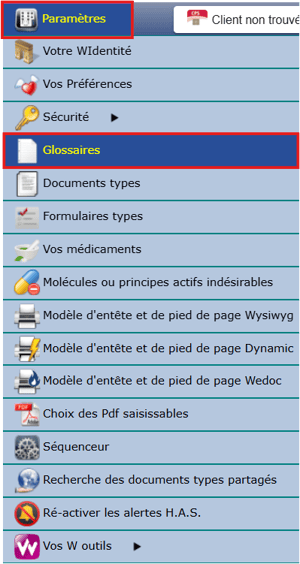 • Pour accéder à la page des classifications de pièces jointes, aller dans le menu "paramètres" puis dans "glossaires" :