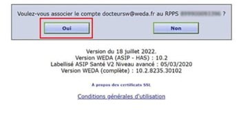 - Un message de confirmation demande alors de valider l'association entre le compte WEDA (qualifié par l'adresse email qui sert d'identifiant WEDA) et l'identifiant Pro Santé Connect (qualifié par le n° RPPS associé). Cliquer sur "Oui" :
