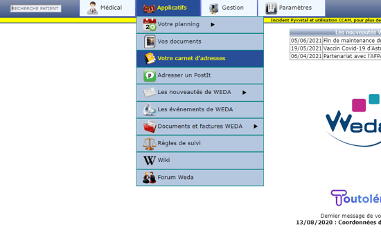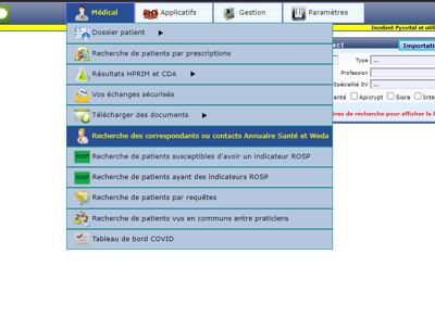 - Pour ouvrir l'Annuaire Santé, aller dans le menu "Médical" et cliquer sur "Recherche des correspondants ou contacts Annuaire Santé et WEDA".
