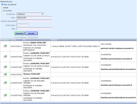- Lorsque la personne recherchée est à l'écran, cliquer sur le "+" se trouvant dans la colonne de gauche pour ajouter ce professionnel de santé au carnet d’adresses (il n'est pas rare qu'un professionnel de santé ait plusieurs entrées dans l'Annuaire) :