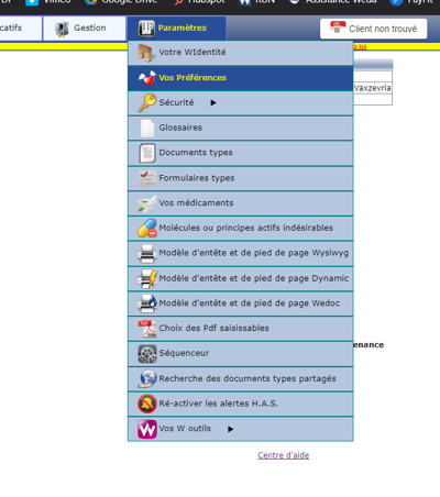 - Pour la recherche dans la base WEDA, un ou plusieurs départements seront sélectionnés par défaut. Pour modifier cette liste de départements, aller dans le menu "Paramètres", et cliquer sur "Vos Préférences" :