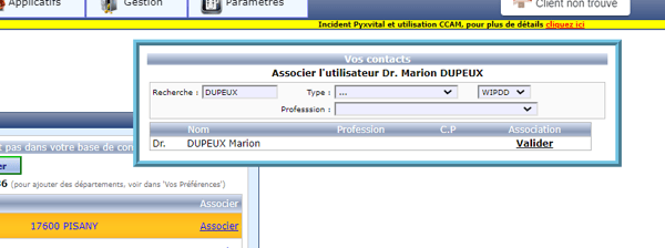 - L’option "Associer" permet de faire le lien entre un contact déjà présent dans le carnet d’adresses et une personne présente dans la liste. En cliquant sur "Associer" la recherche se fait automatiquement, si un contact du carnet d'adresses est trouvé et qu’il correspond, il suffit de cliquer sur "Valider" pour terminer l’association et importer les information de la base WEDA dans la fiche du carnet d'adresses :