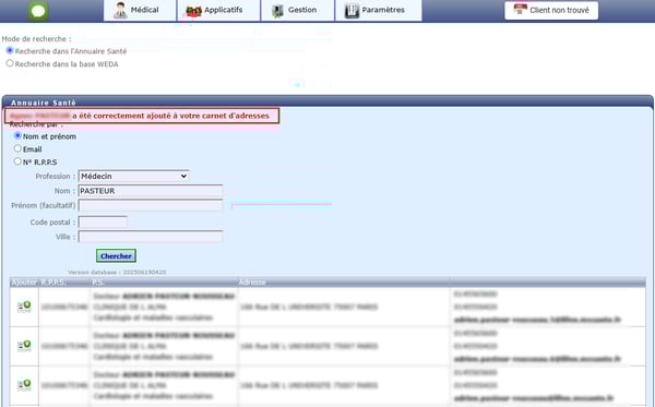 - Un message rouge indique que l'ajout du professionnel de santé au carnet d'adresse s'est faite correctement :