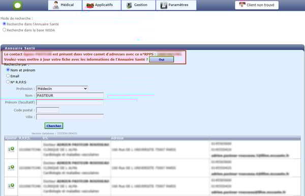 Afin de remplir le Carnet d’Adresse plus efficacement, il est possible de retrouver les professionnels de santé dans l’Annuaire Santé, et importer leurs informations professionnelles dans une nouvelle fiche du Carnet d'Adresse, ou de mettre à jour un contact existant.