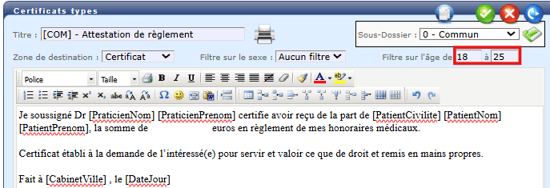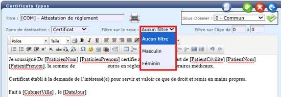 - Plusieurs filtres permettent de définir, au cas par cas, si un document ou formulaire type doit être disponible, en fonction du patient (âge, sexe).