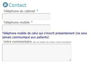 - Coordonnées : Indiquer le numéro de téléphone du cabinet où le remplacement est effectué ainsi que le numéro de téléphone mobile de contact. Ce dernier ne sera jamais communiqué aux patients. Il est possible d’ajouter un commentaire si besoin :