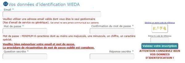 - Données d'identification WEDA : Pour créer le compte, saisir une adresse e-mail valide dont le titulaire du compte est le seul gestionnaire, un mot de passe (8 caractères minimum, 1 spécial, 1 majuscule et 1 chiffre) et confirmer ce dernier. Enfin, saisir une question secrète et sa réponse, utiles en cas d'oubli du mot de passe :