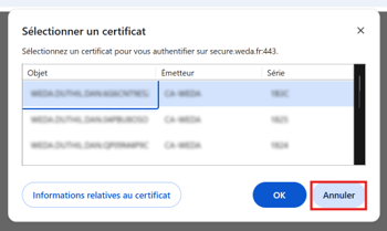 - Si une fenêtre demandant de sélectionner un certificat apparait, cliquer sur annuler afin de pouvoir poursuivre :