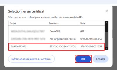 - Si une fenêtre de sélection de certificat apparait qui contient un certificat CPS (correspondant au numéro RPPS de l'utilisateur), sélectionner ce certificat et cliquer sur "OK" :