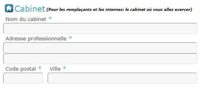 - Informations du cabinet : Compléter le nom du cabinet où le remplacement sera effectué ainsi que l’adresse, le code postal et la ville :