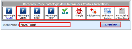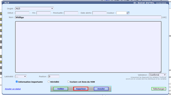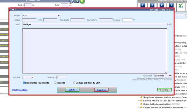 - Le pavé de texte au centre permet de saisir des informations en texte libre sur la pathologie concernée, un historique, des remarques, etc. .