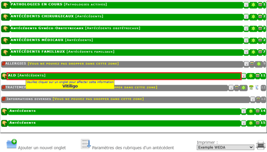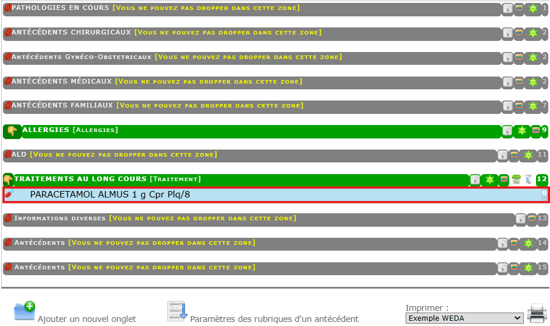 - ⚠️ Attention : pour les familles d'onglets "Allergie" et "Médicament" (voir notre article sur les Onglets d'antécédents), la méthode de dépôt n'a pas d'importance et l’antécédent est toujours déposé dans l’onglet sans ouverture du bloc d'informations. Pour ouvrir la fenêtre d’édition, cliquer sur l’antécédent lui-même :