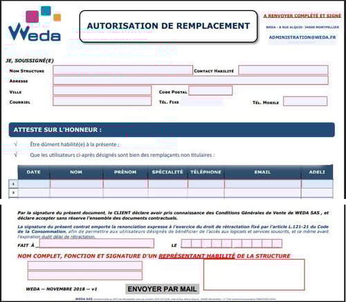 - Après avoir téléchargé l’autorisation de remplacement, compléter le document et le retourner signé par un représentant habilité de la structure à l’adresse administration@weda.fr :