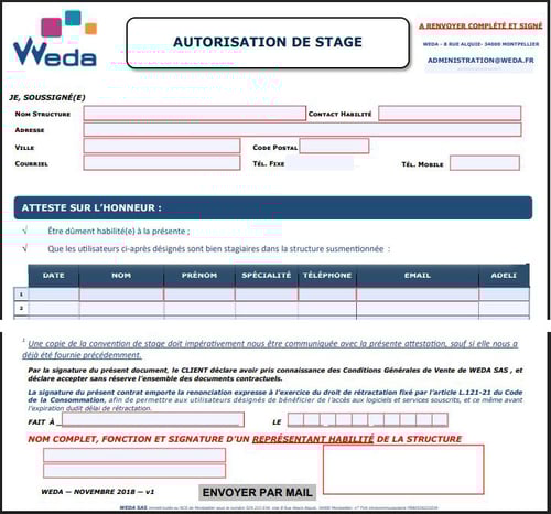 - Après avoir téléchargé l’autorisation de stage, compléter le document et le retourner signé par un représentant habilité de la structure à l’adresse administration@weda.fr :