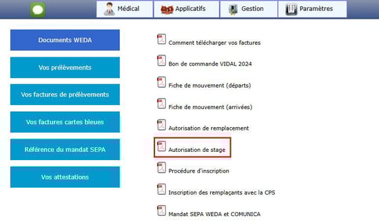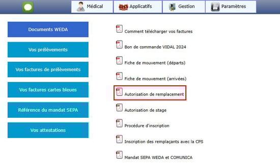 - Ce document est disponible dans le menu "Applicatifs" puis "Documents et factures WEDA" :