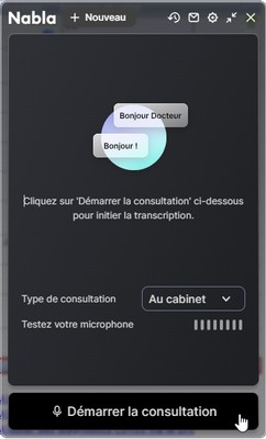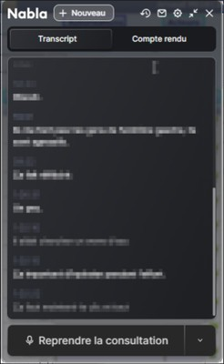- Cliquer sur Démarrer la consultation. Après l'échange avec le patient, le contenu de la discussion est présent dans le menu "Transcript".