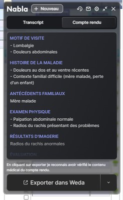 - Lors de la consultation avec WEDA, cliquer sur l’extension lance l'outil Nabla pour la consultation :