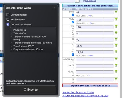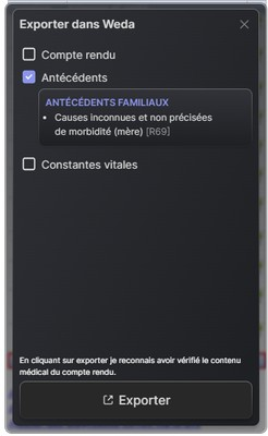 - Pour importer les textes générés, après avoir sélectionné les éléments voulu, cliquer sur "exporter dans Weda".