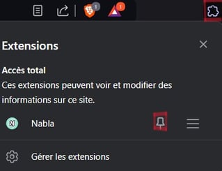 1. Pour activer Nabla sur le navigateur et en faciliter l'accès, cliquer sur la pièce de puzzle et sur la punaise à droite de l'extension afin de l’épingler au navigateur.