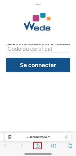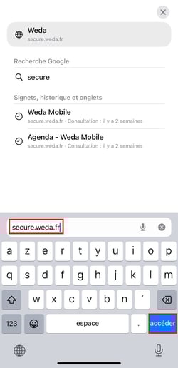 - Lancer Safari et renseigner l’adresse dans la barre de recherche en bas de l’écran, secure.weda.fr (pour les utilisateurs en métropole) ou run.weda.fr (pour les utilisateurs à la Réunion), puis sélectionner "accéder" :