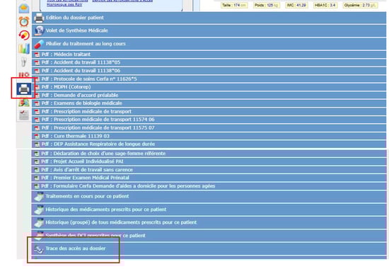 - Ce document PDF, retraçant l’ensemble des actions est présent dans le menu Imprimante en bas à gauche du dossier patient. Il est possible de l’imprimer ou de le télécharger :