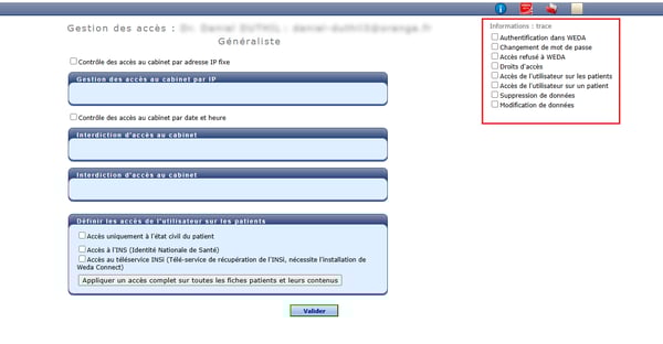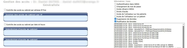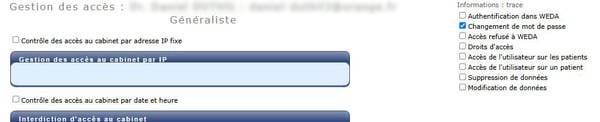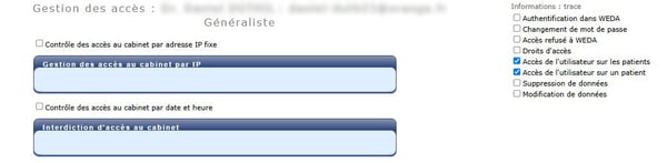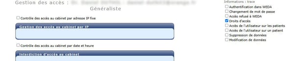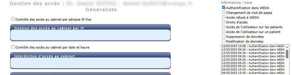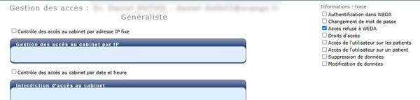 Il est possible d’activer des enregistrements de Log afin de sauvegarder l'historique des accès à la structure WEDA en détail. Il est aussi possible de refuser l’accès à WEDA pour les utilisateurs d’un cabinet.